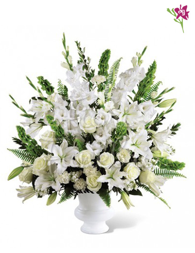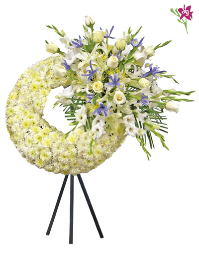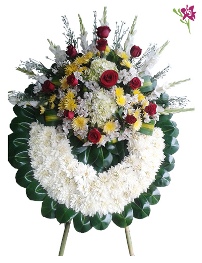 Exclusiva cruz en tripode de fierro, lleno de pompos, rosas importadas y fino follaje.