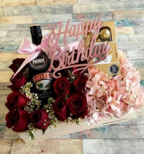 Caja cuadrada de rosas y hortensia